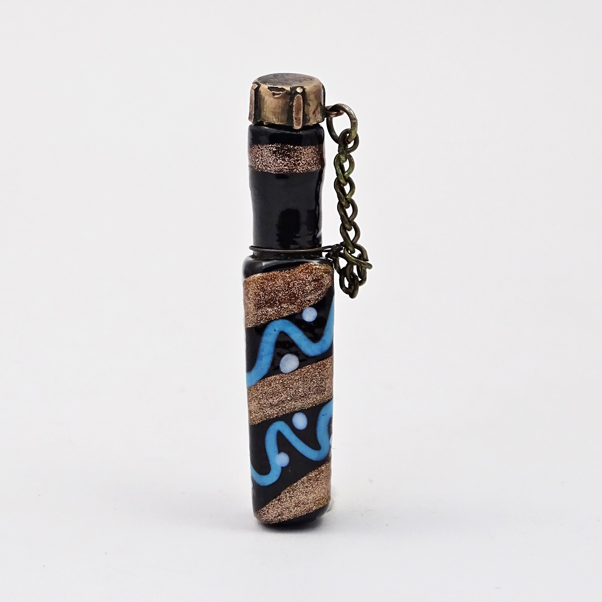 Square scent bottle in a black glass lampwork bead with aventurine bands and blue waves Discover more