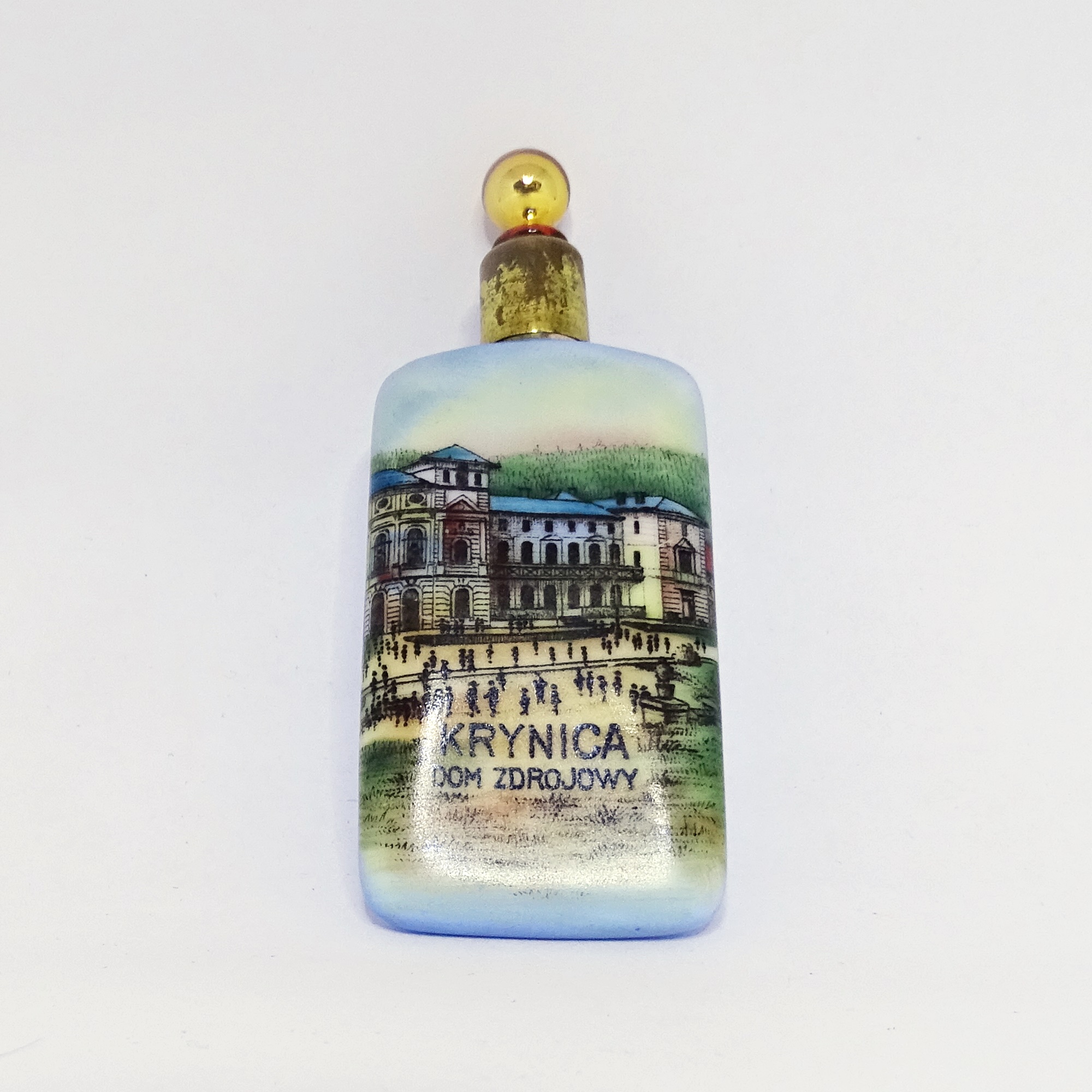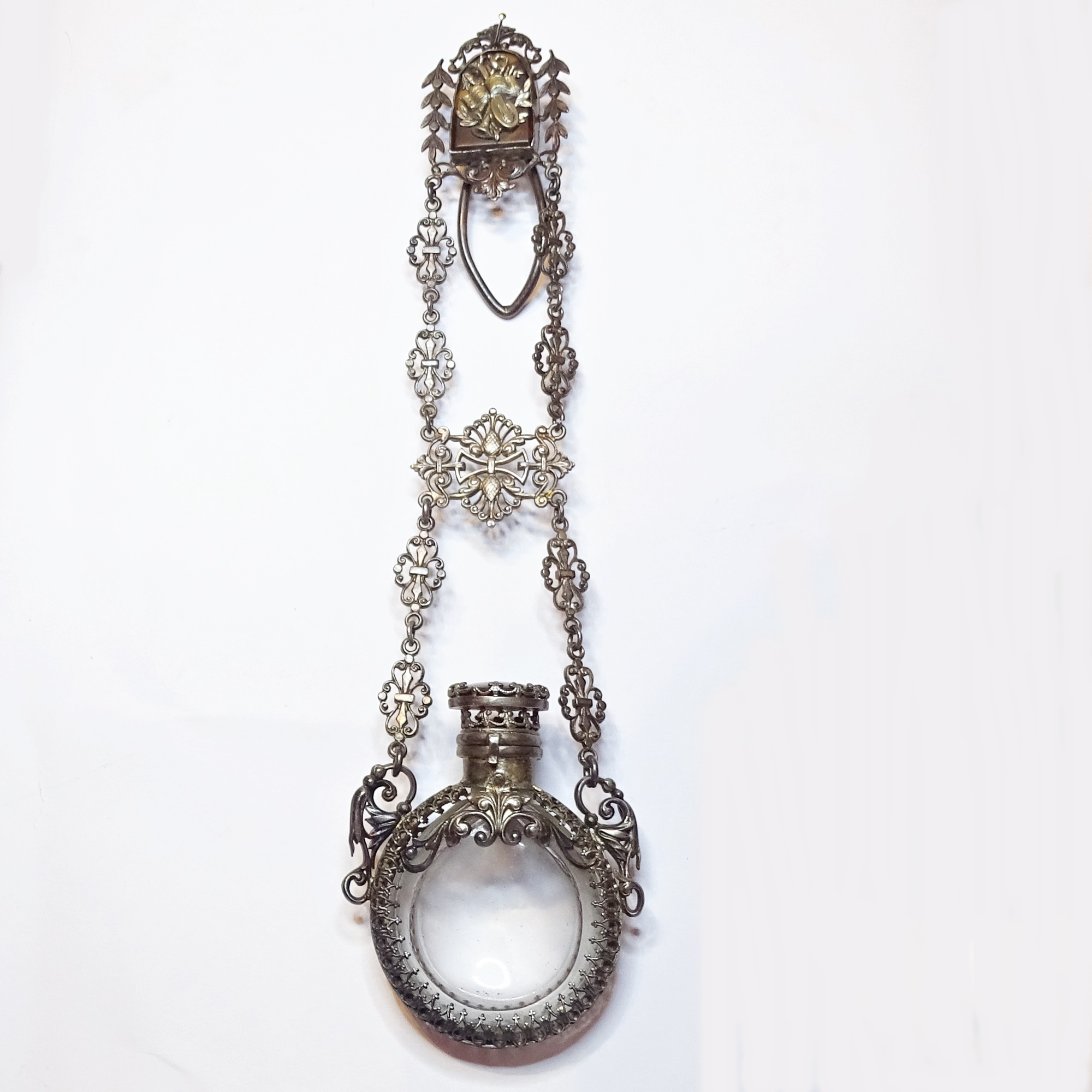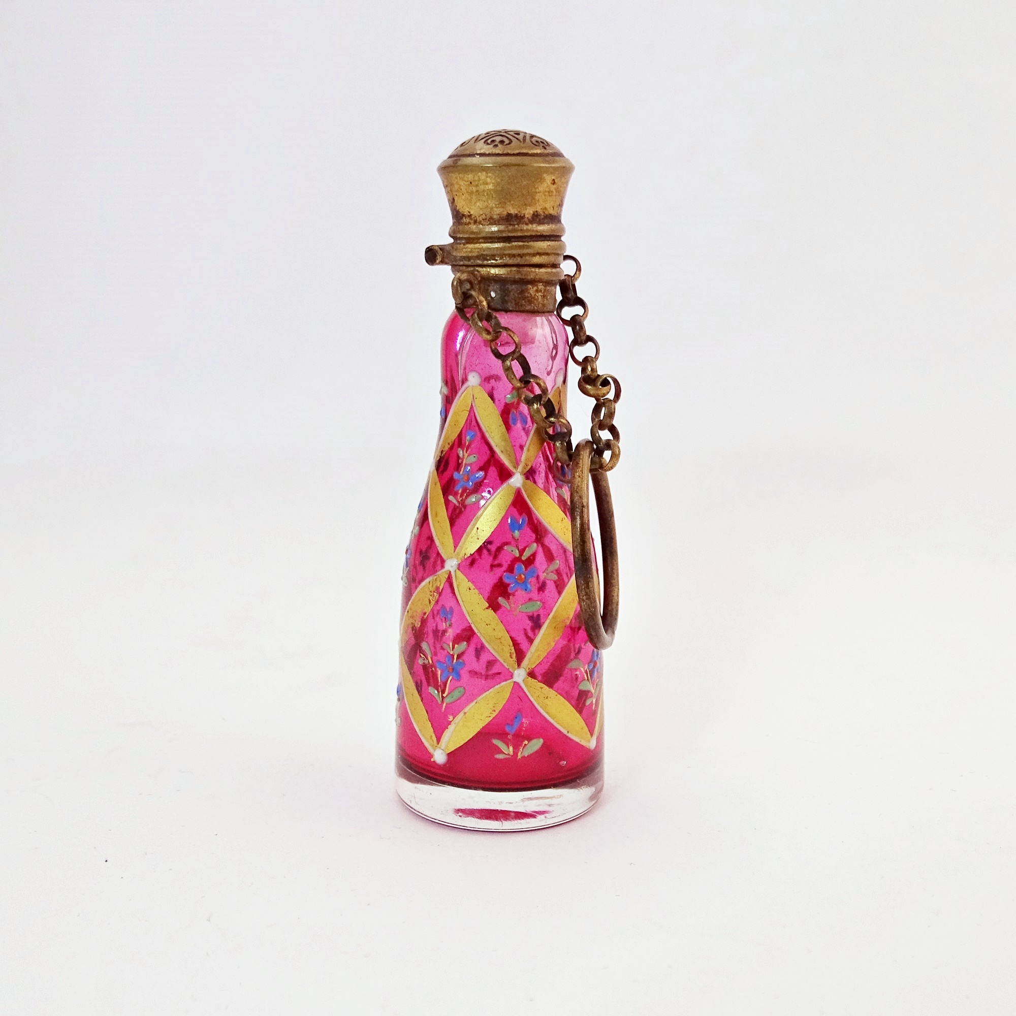 Chatelaine scent bottle in red glass, painted with golden diamonds and blue tiny flowers Discover more