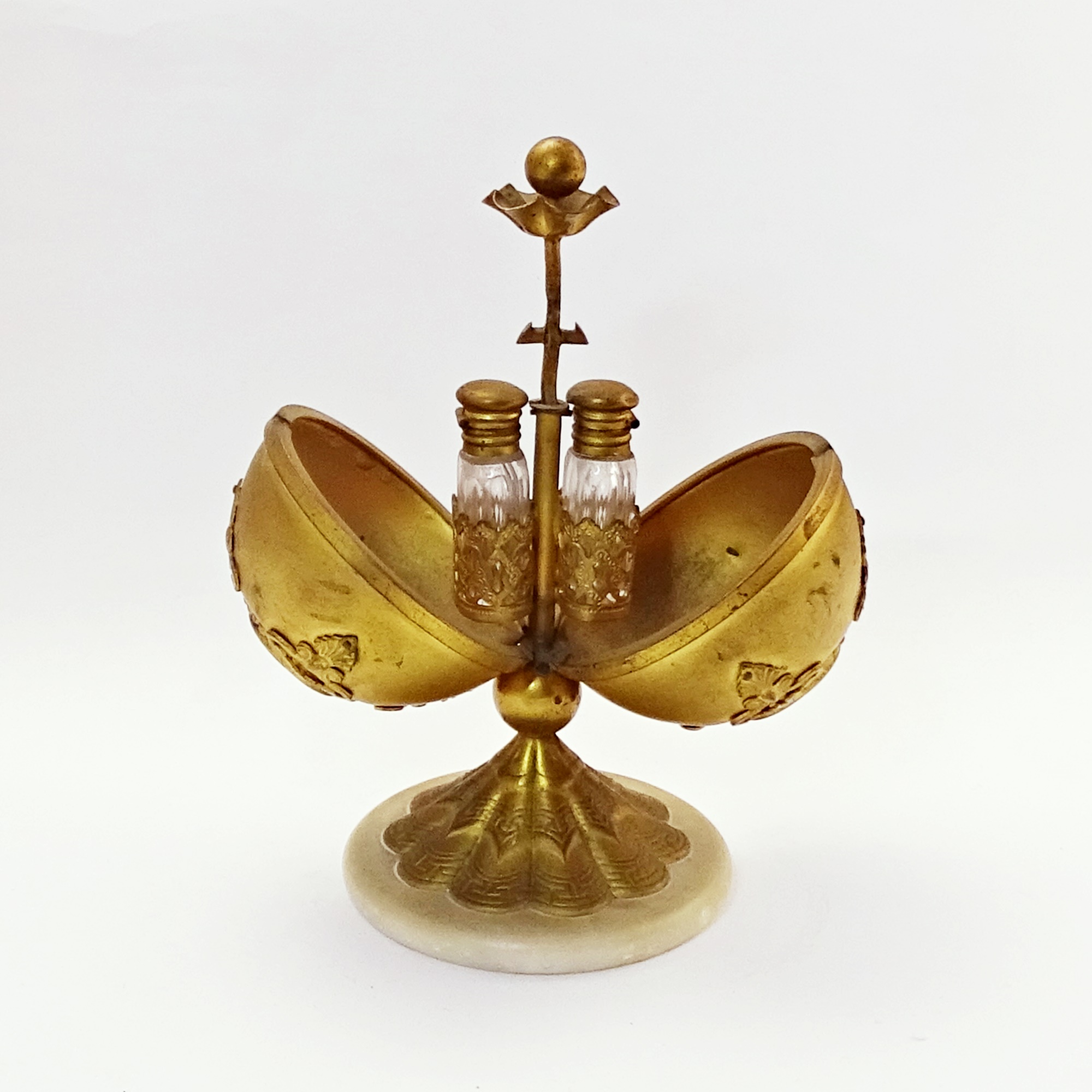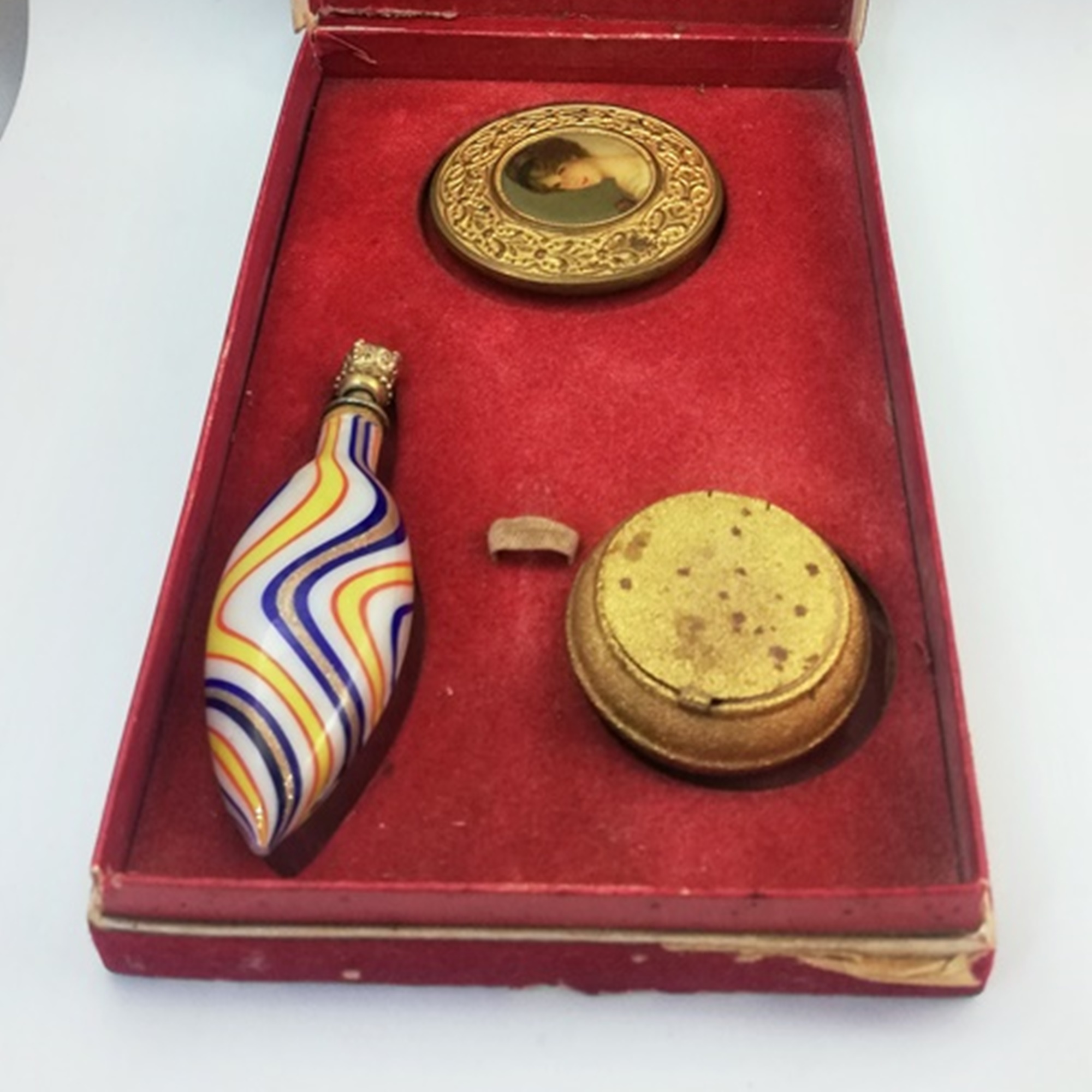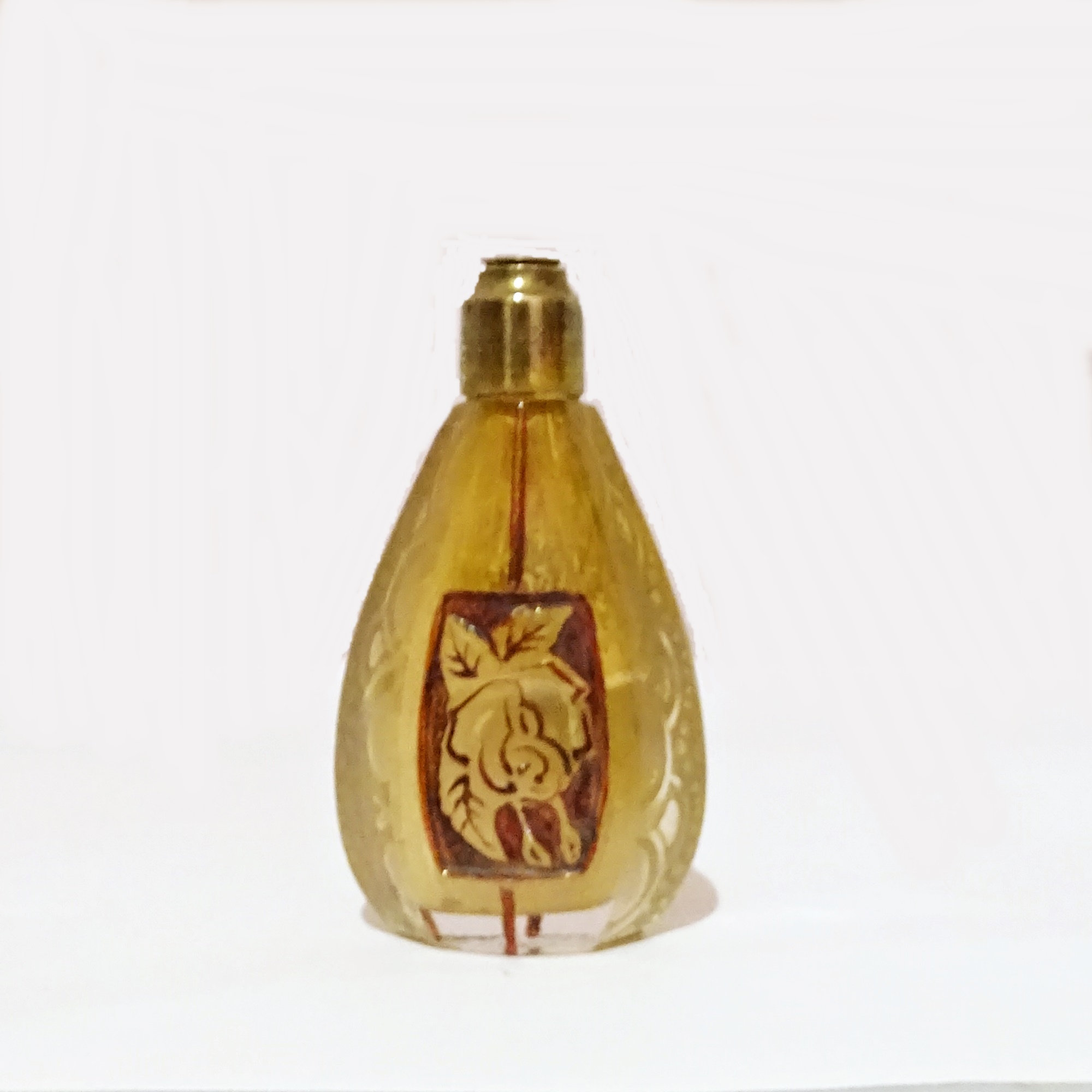 Chatelaine scent bottle in red glass, painted with golden diamonds and blue tiny flowers Discover more