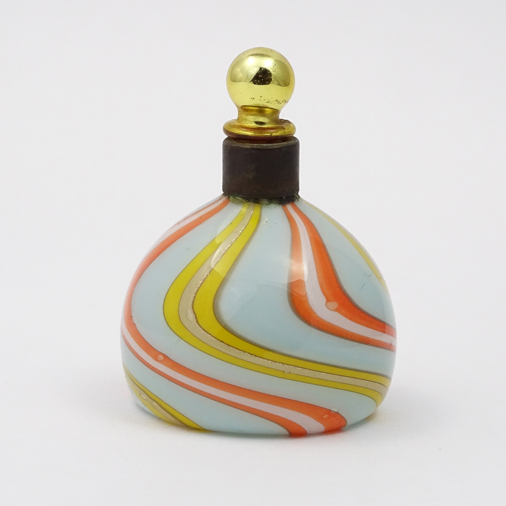 Globular scent bottle in mercury glass with orange and yellow swirls on pale blue ground Discover more