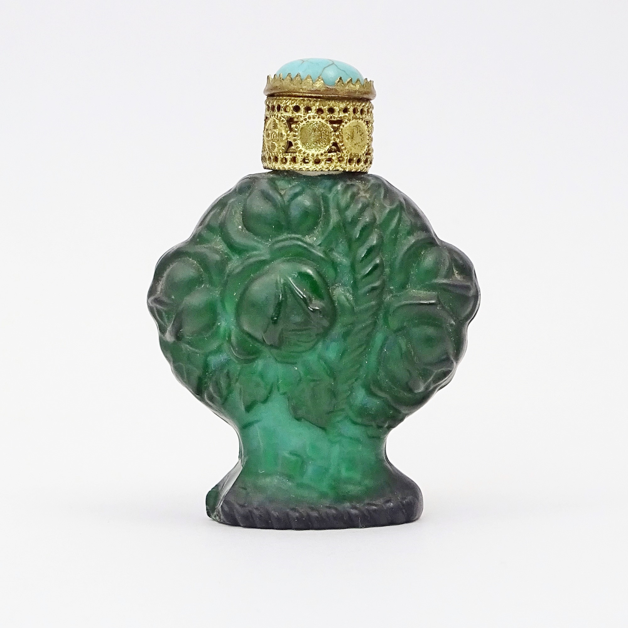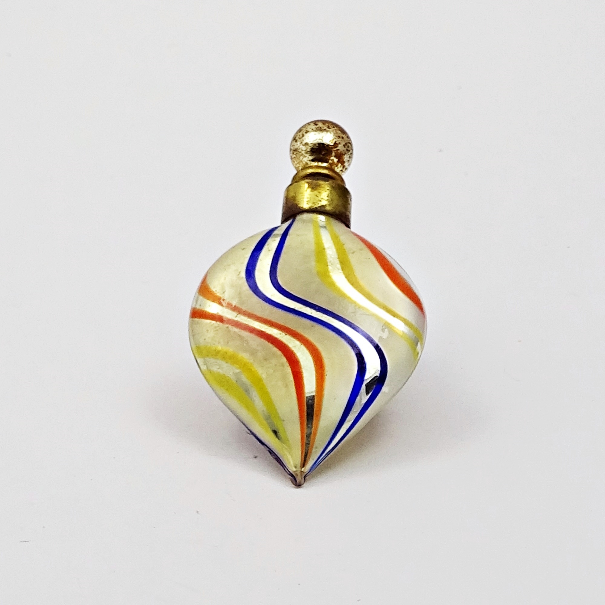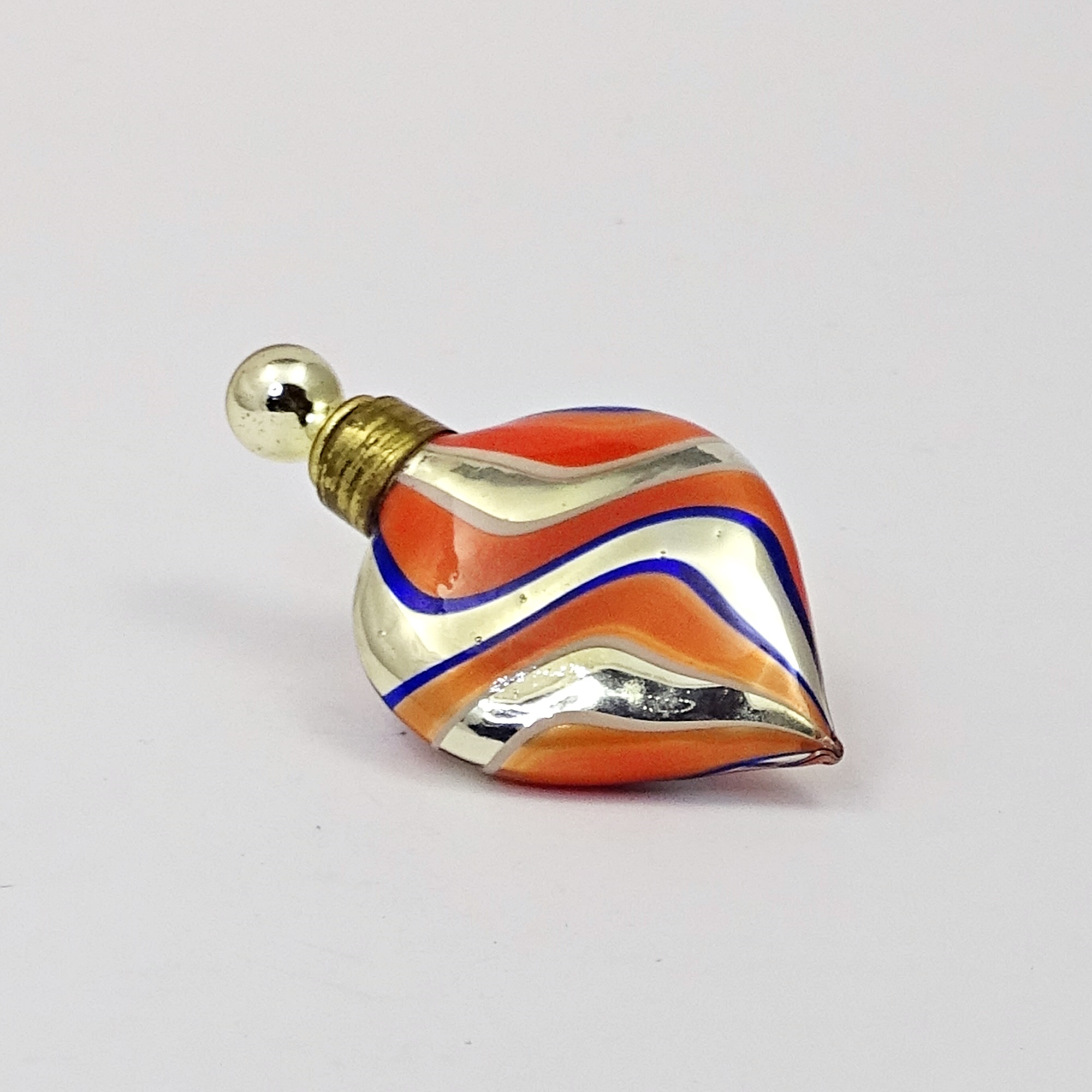 Oval scent bottle in mercury glass with blue and white swirls on orange ground on a pedestal Discover more