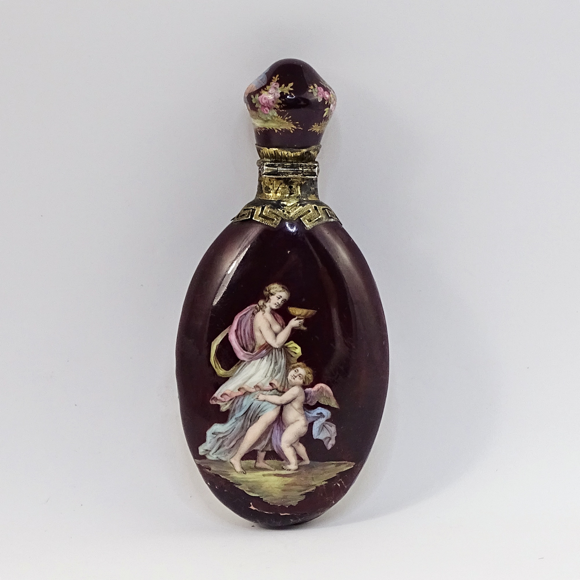 Oval scent bottle in red-brown enamelled porcelain decorated with two classicall scenes Discover more