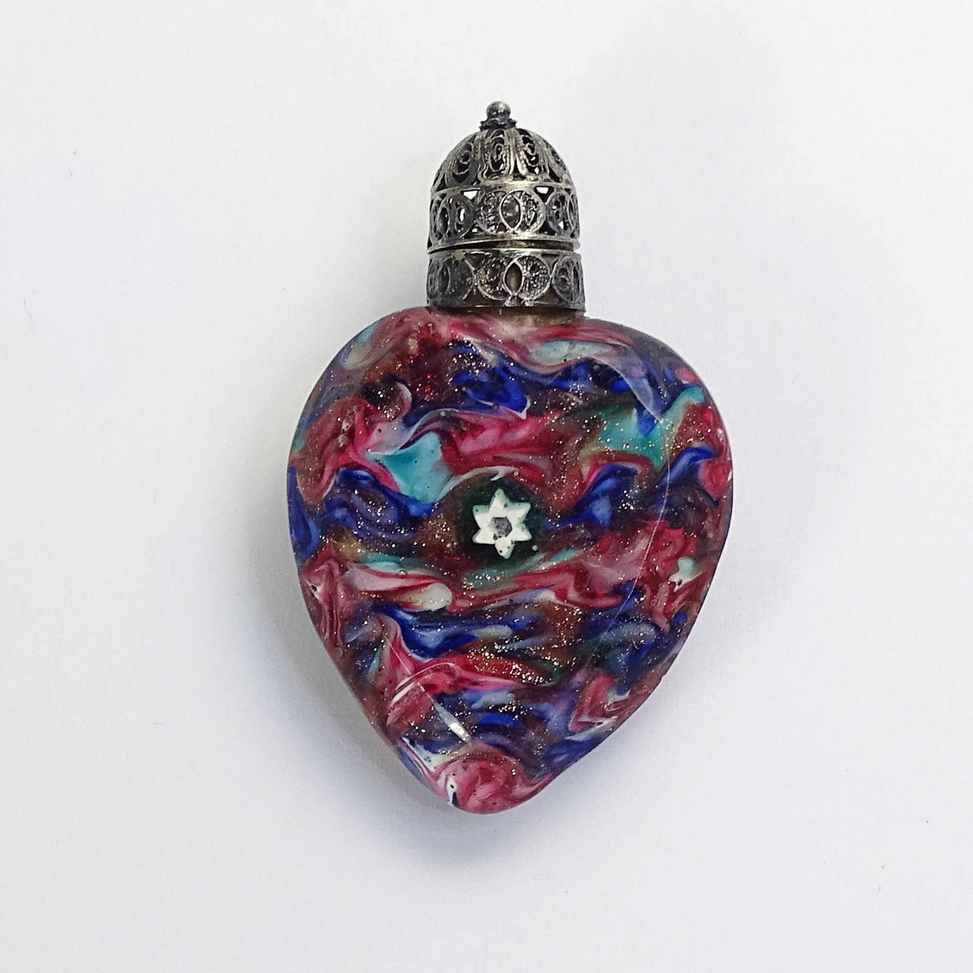 Chatelaine scent bottle in Murano glass with murrine featuring the portraits of three men Discover more
