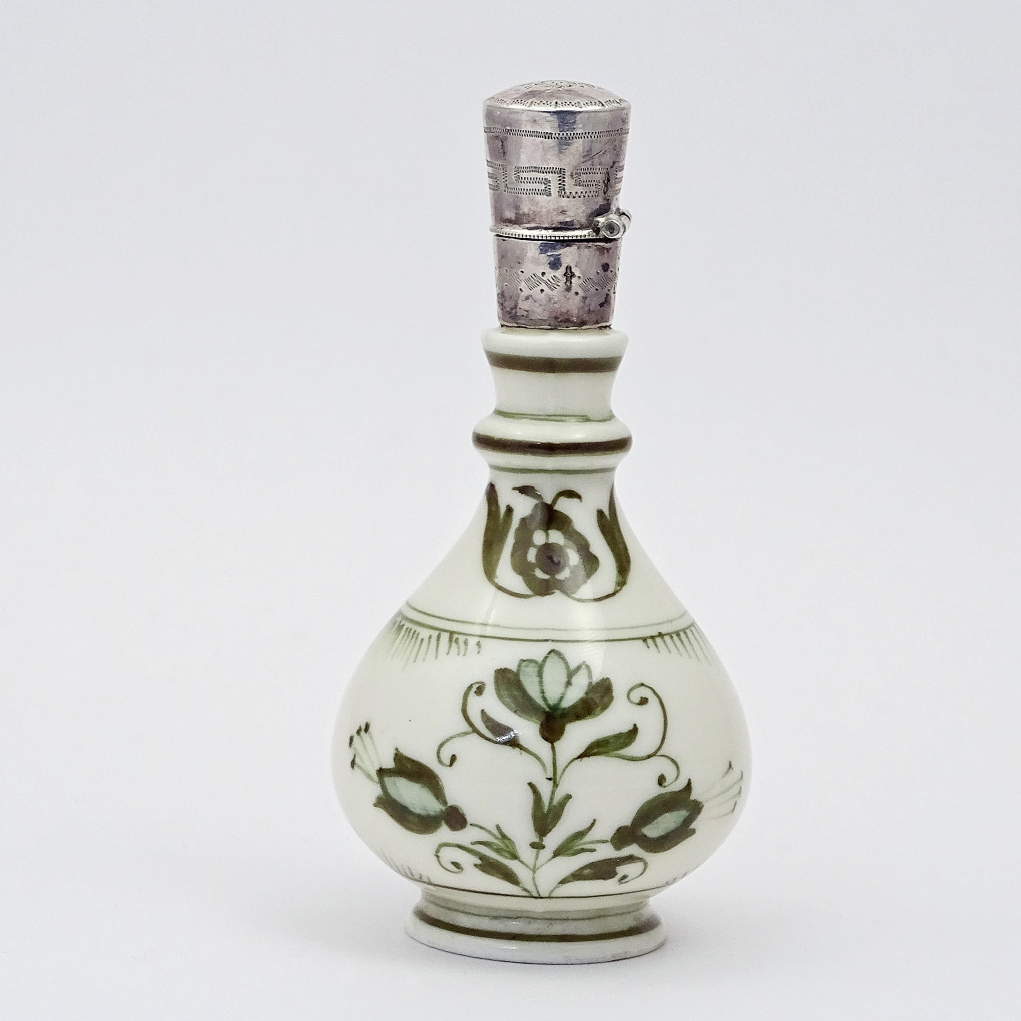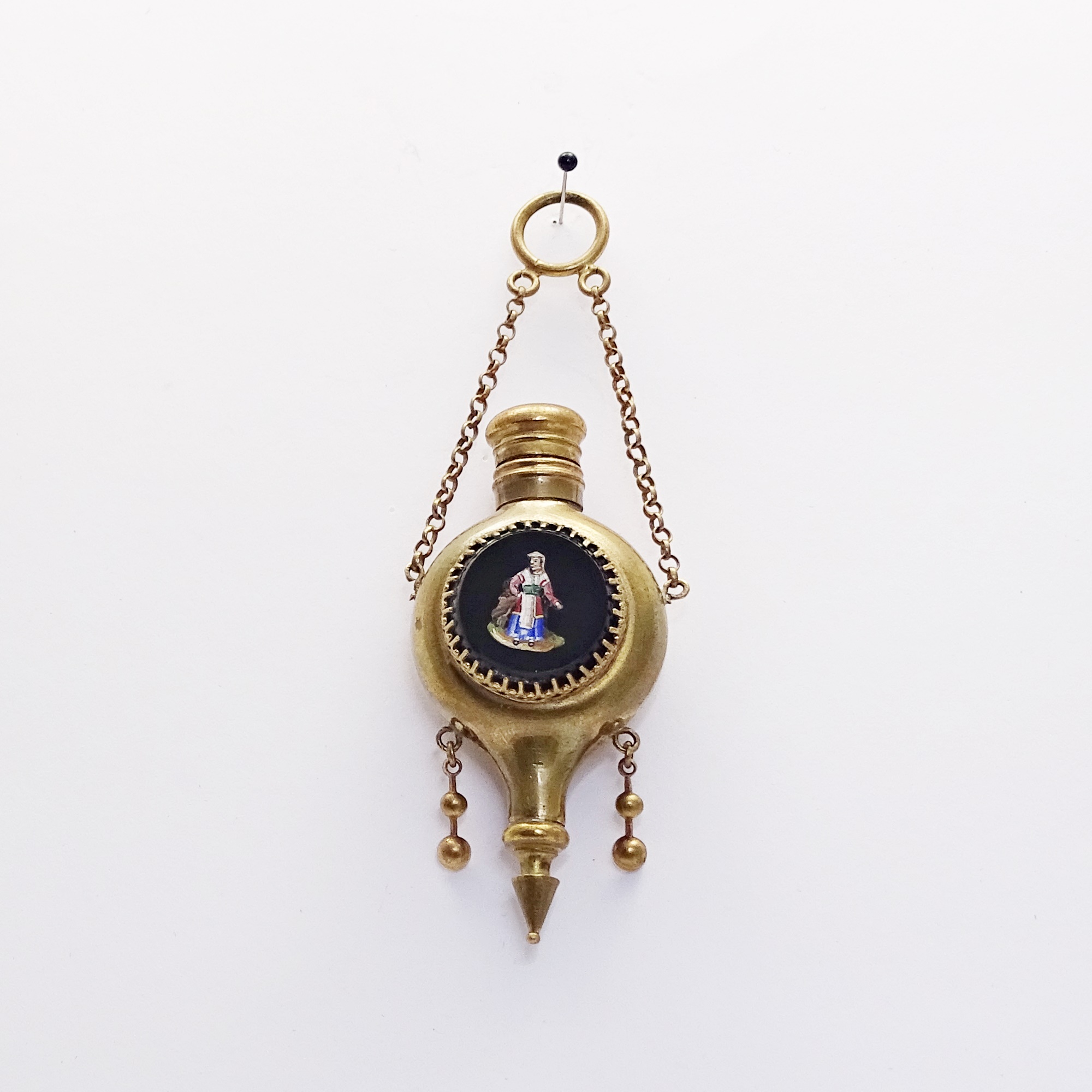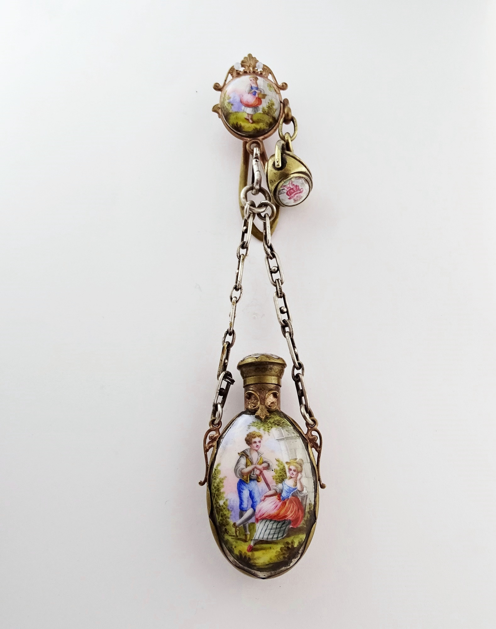 Silver chatelaine bottle engraved with woodland bird scenes, signed by the Swiss Huguenin brothers Discover more