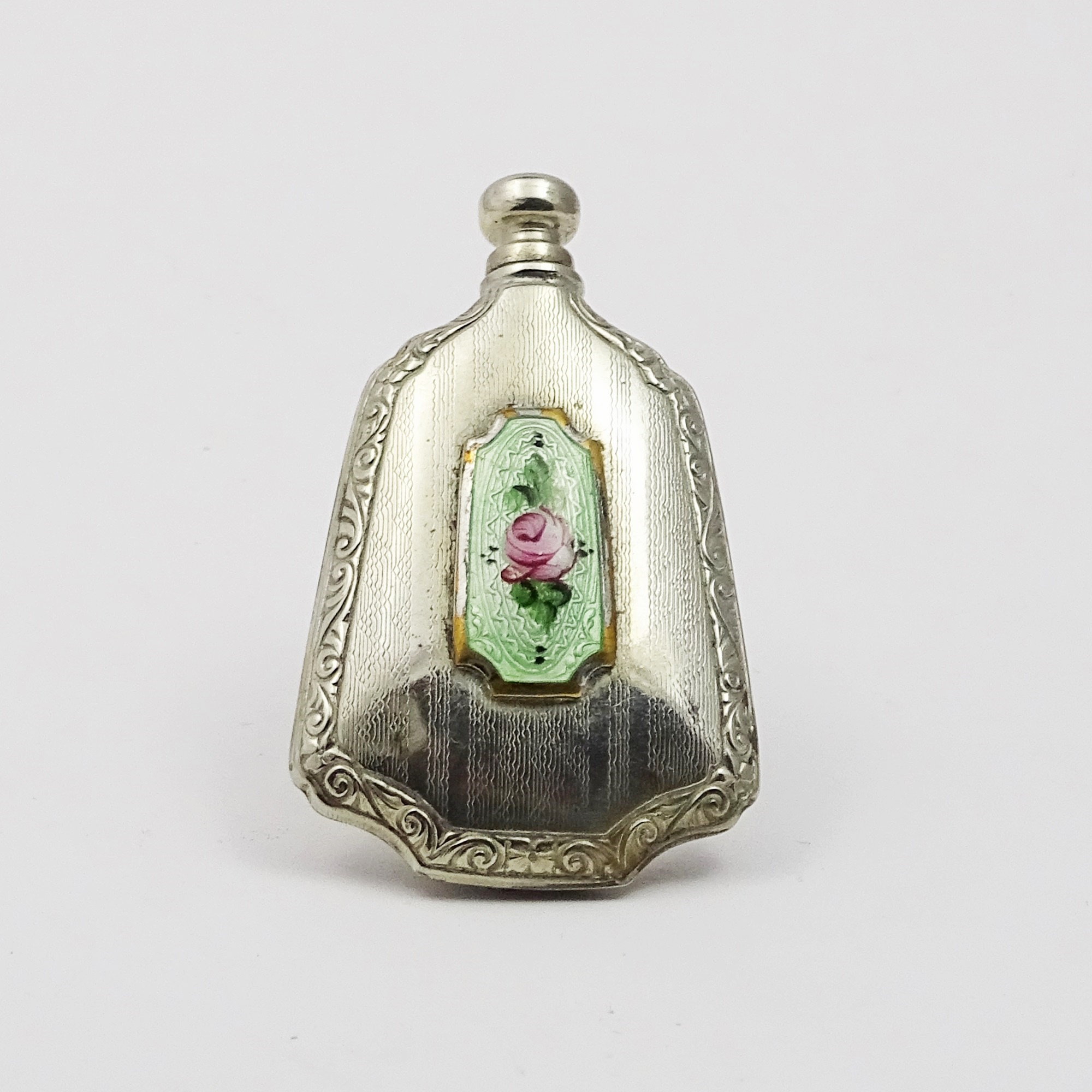Embossed silver plated scent bottle with the profile a woman surrounded by flowers and iris. Discover more