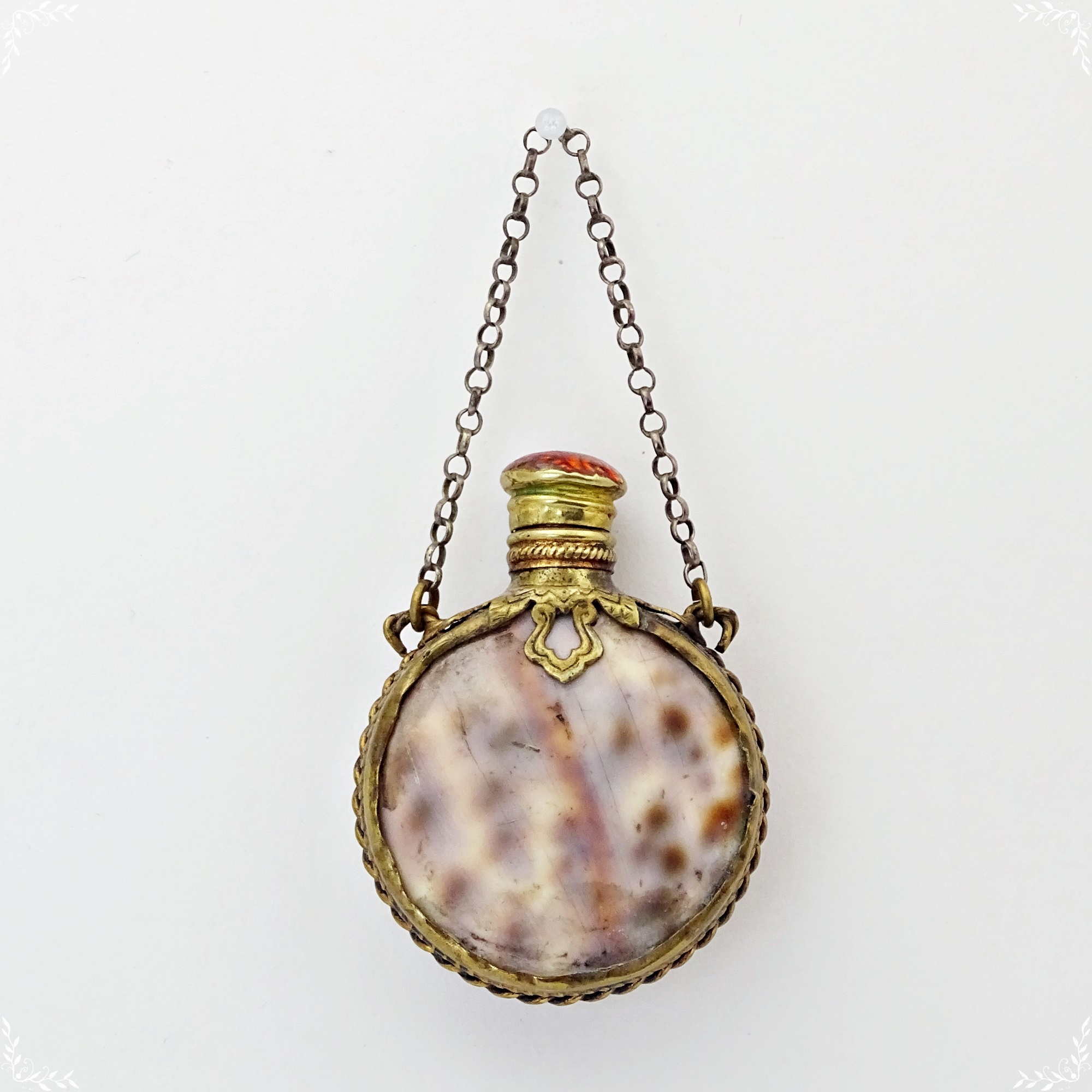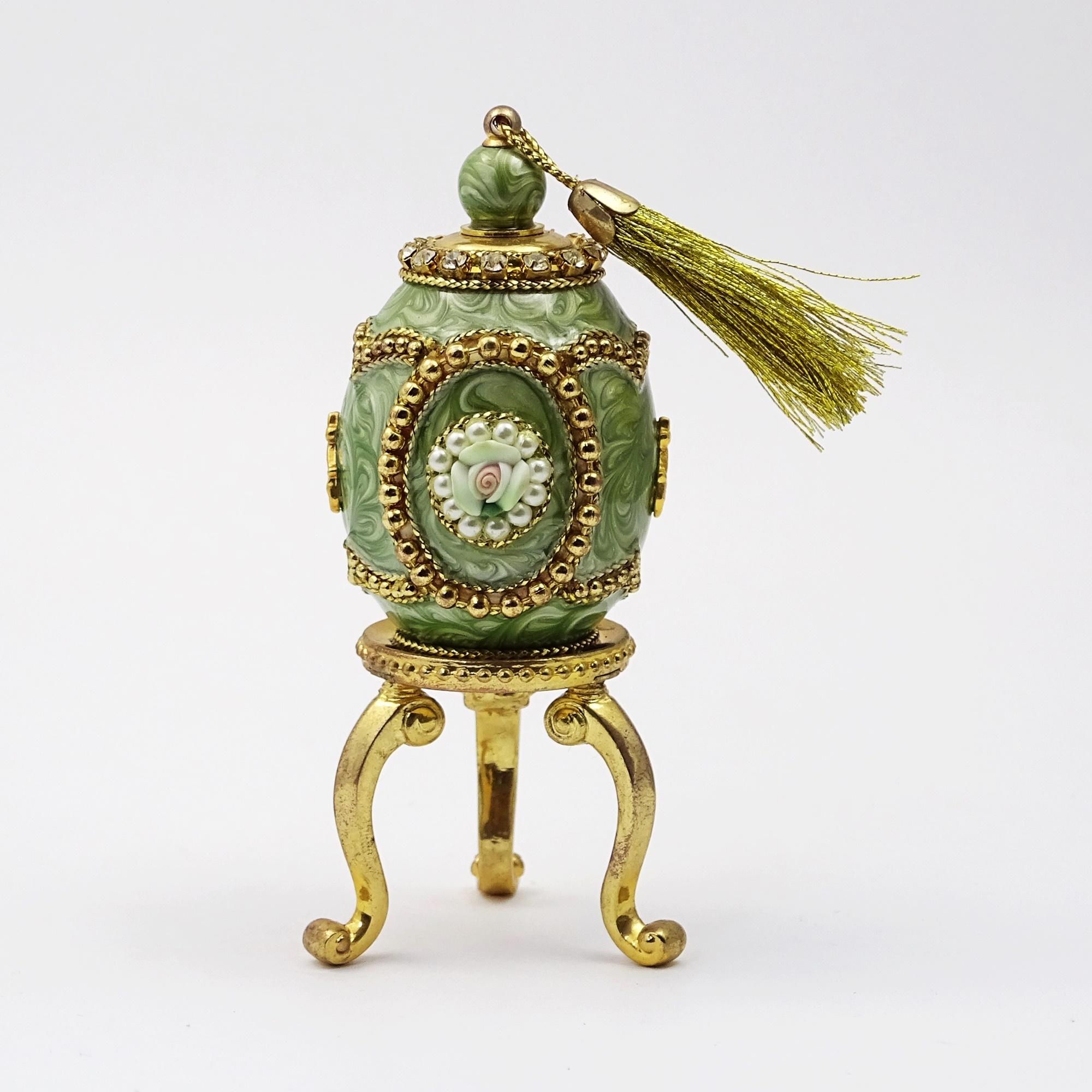 Green scent bottle hand crafted from real pigeon egg decorated with little pearls and golden beads Discover more