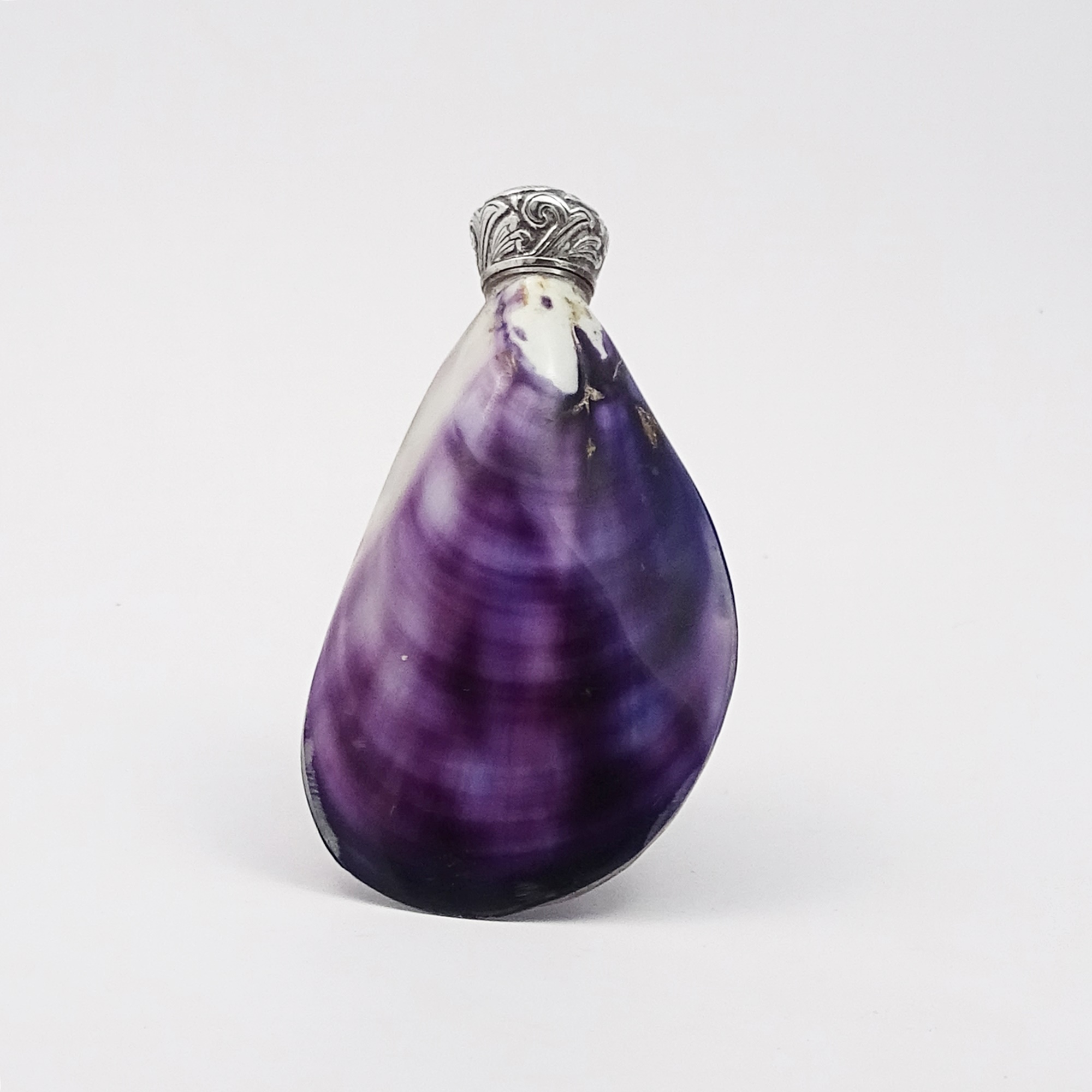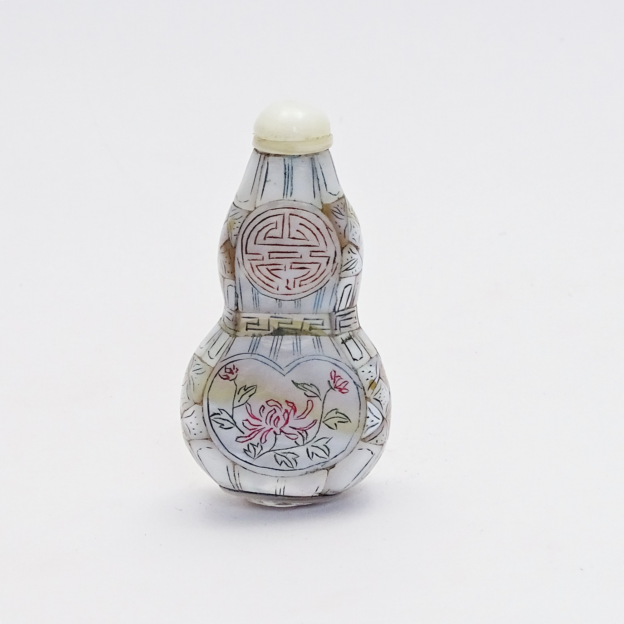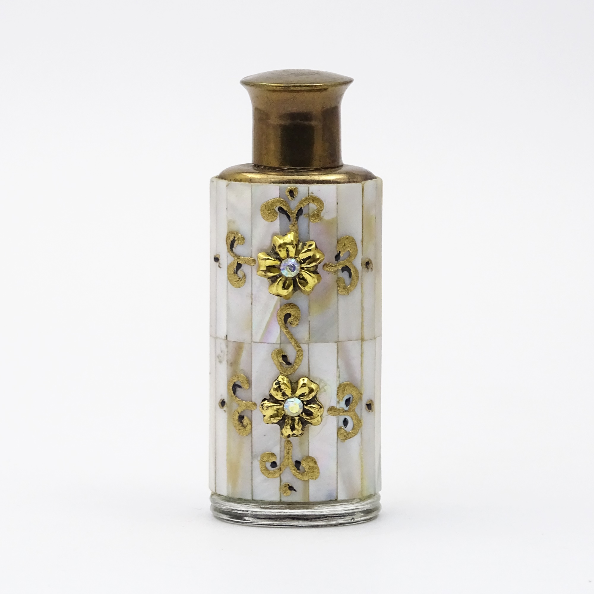 Clear glass scent bottle covered panels of mother of pearl decorate with two little flowers Discover more