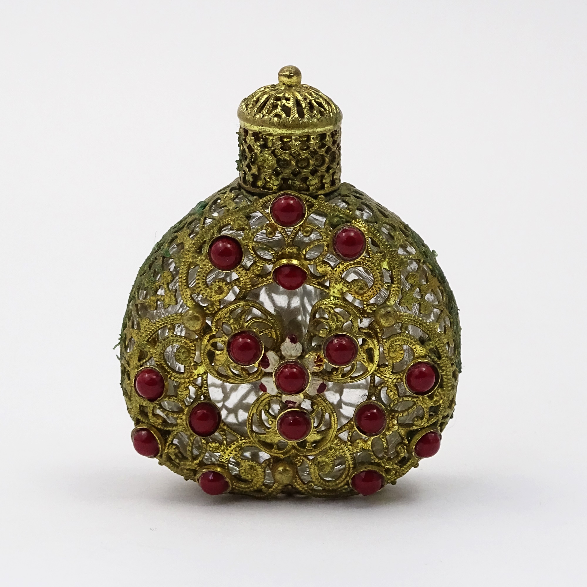 Jeweled glass bottle encased in a brass filigree cage with red pearls and a white enamel flower. Discover more