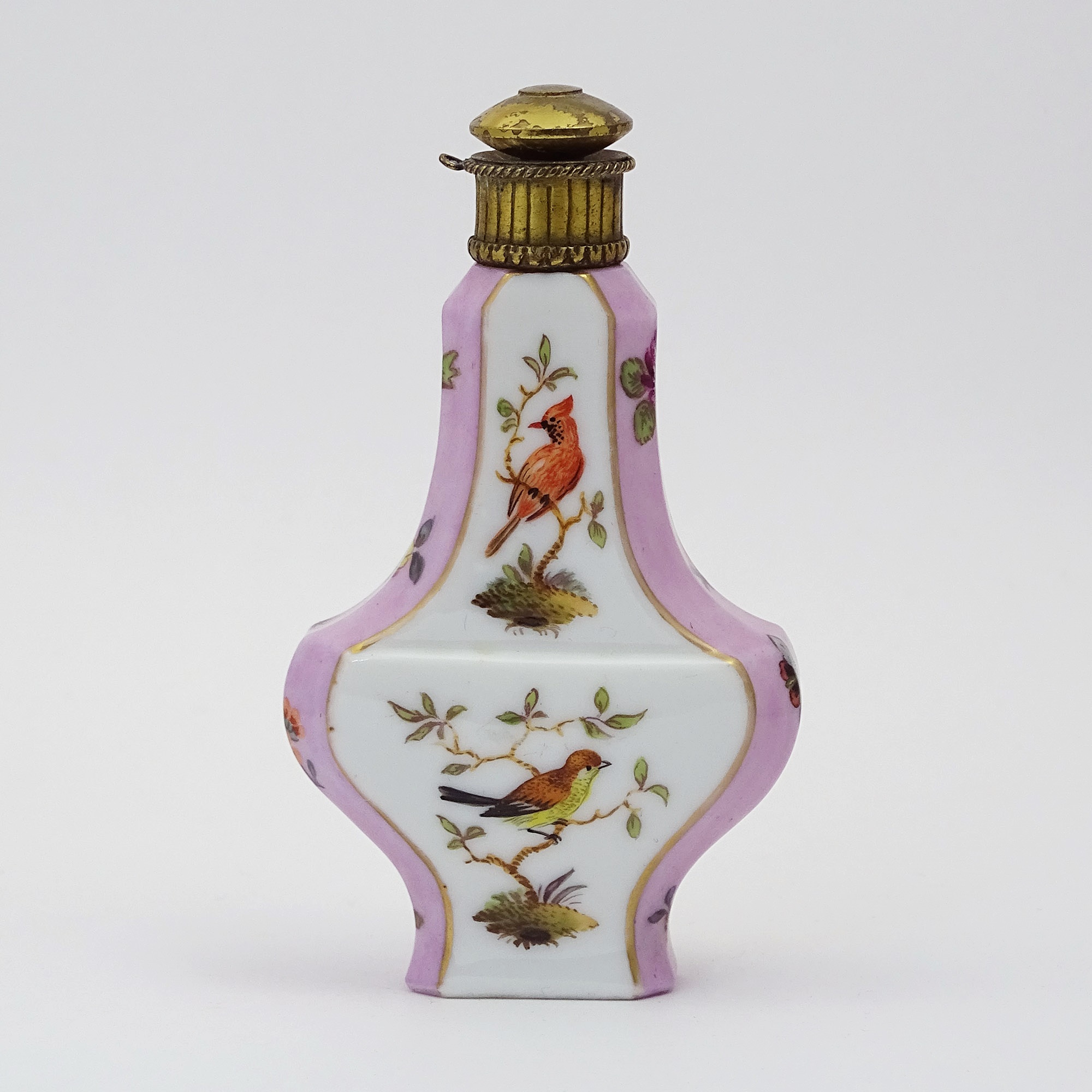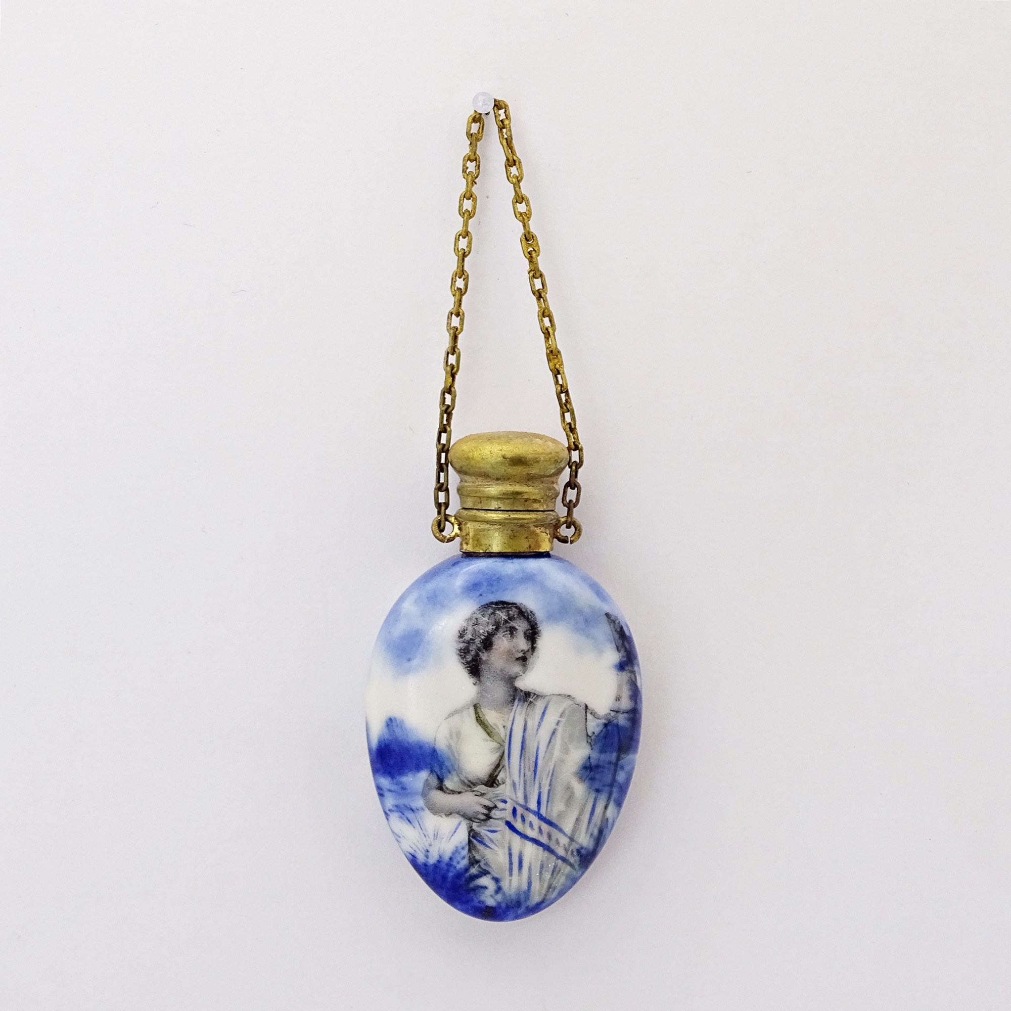 White porcelain scent bottle painted with a scene of two Prussian soldiers on the battle-field Discover more