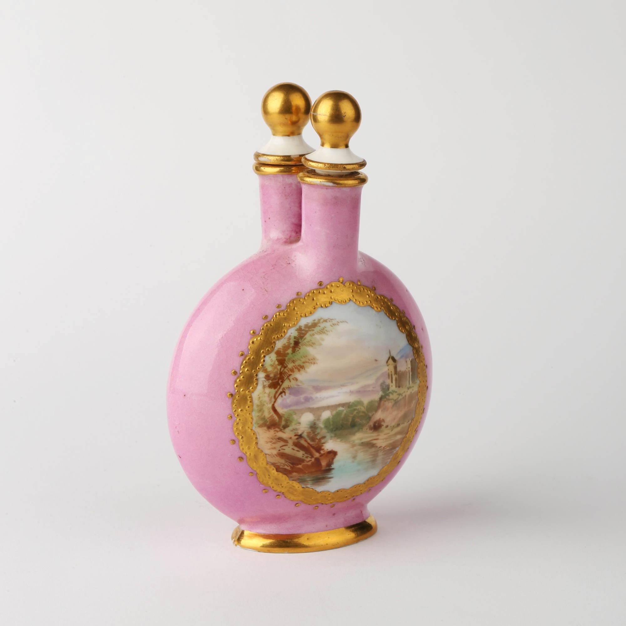 Porcelain scent bottle depicting a lady holding her dress up to reveal a small yellow shoe Discover more