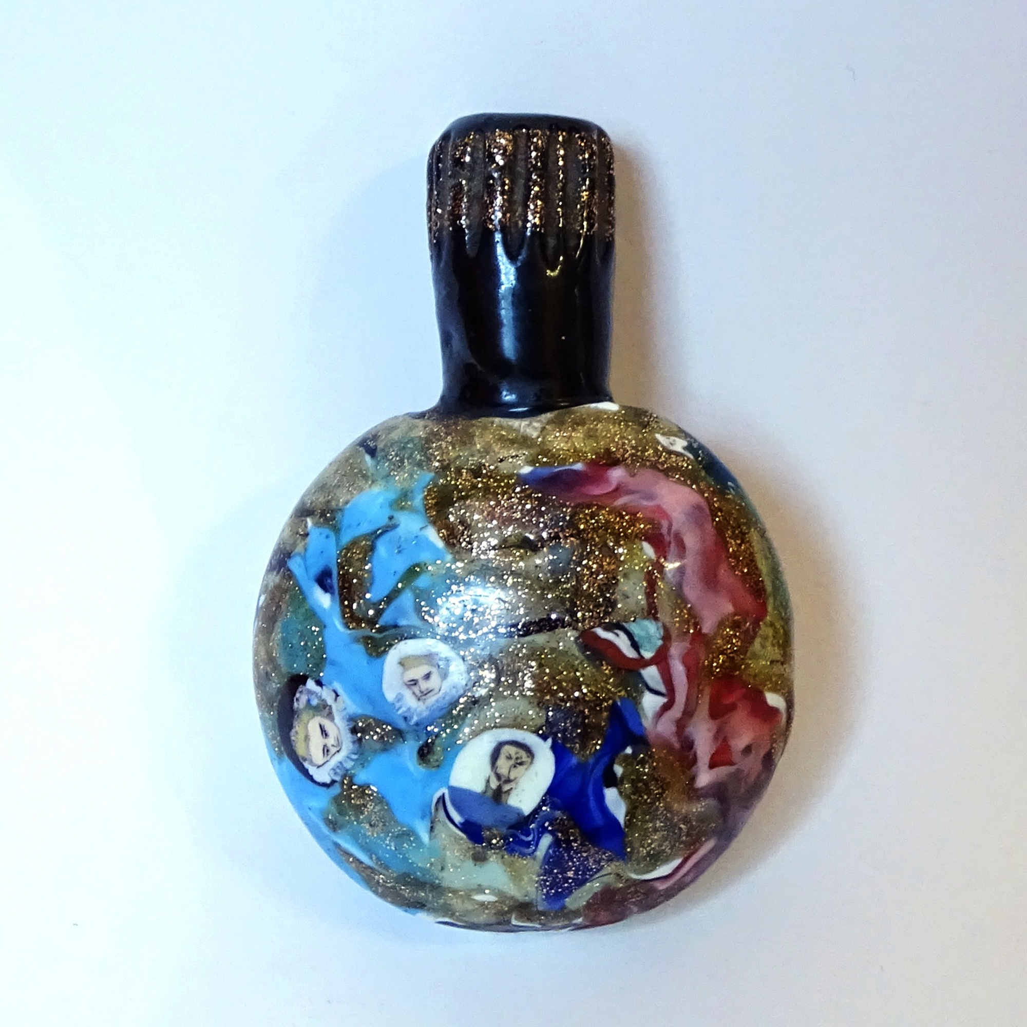 Chatelaine scent bottle in Murano glass with murrine featuring the portraits of three blond men Discover more