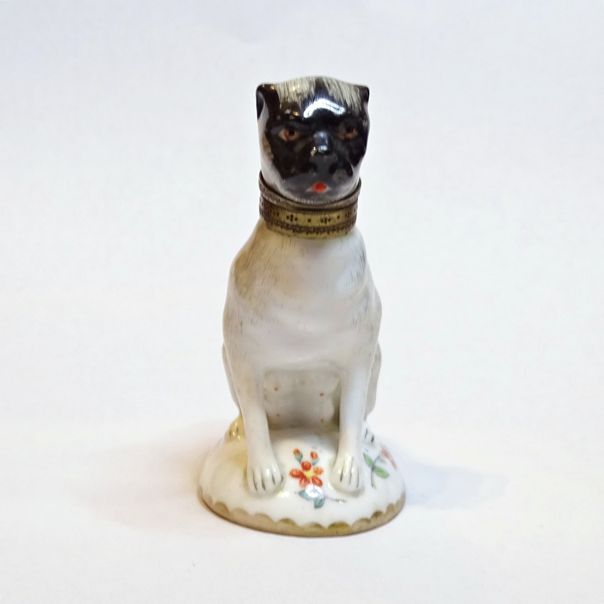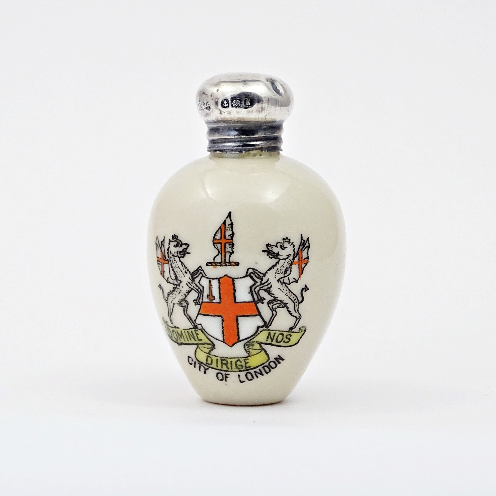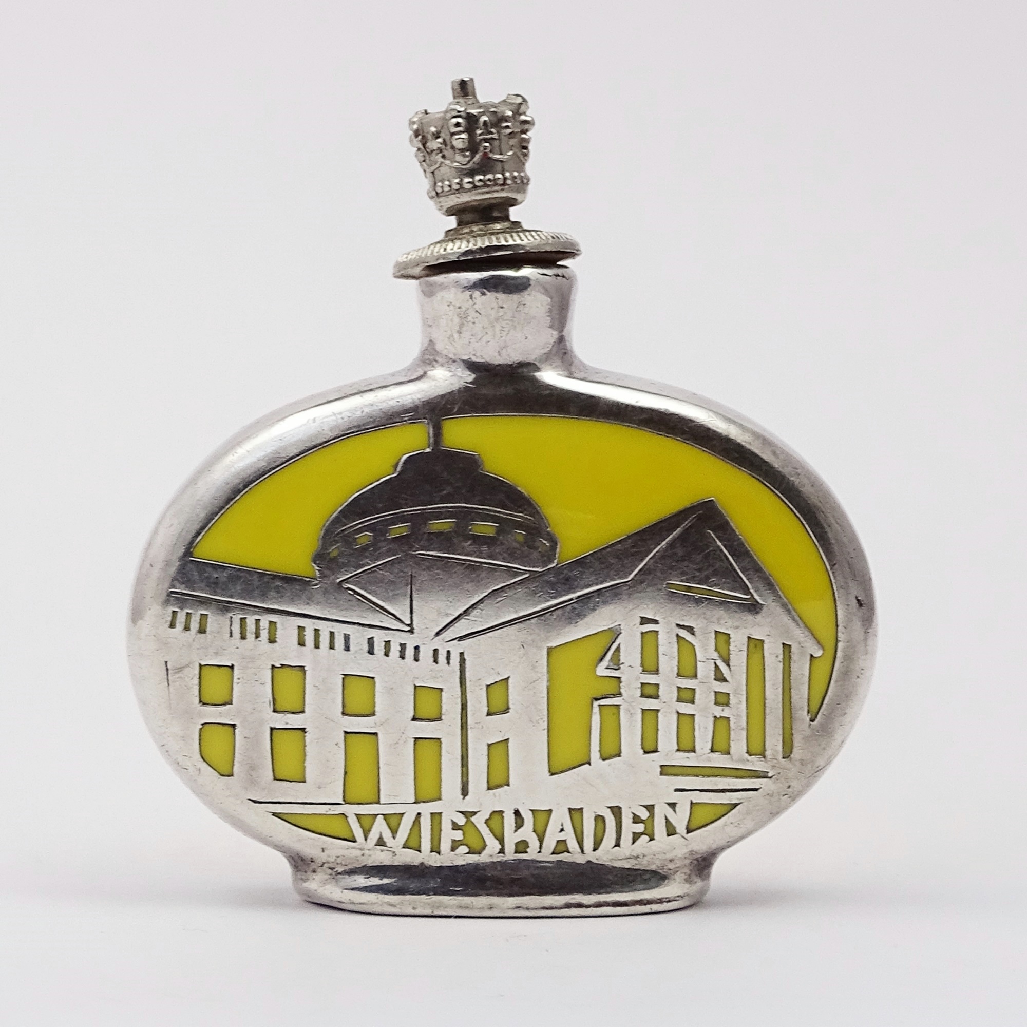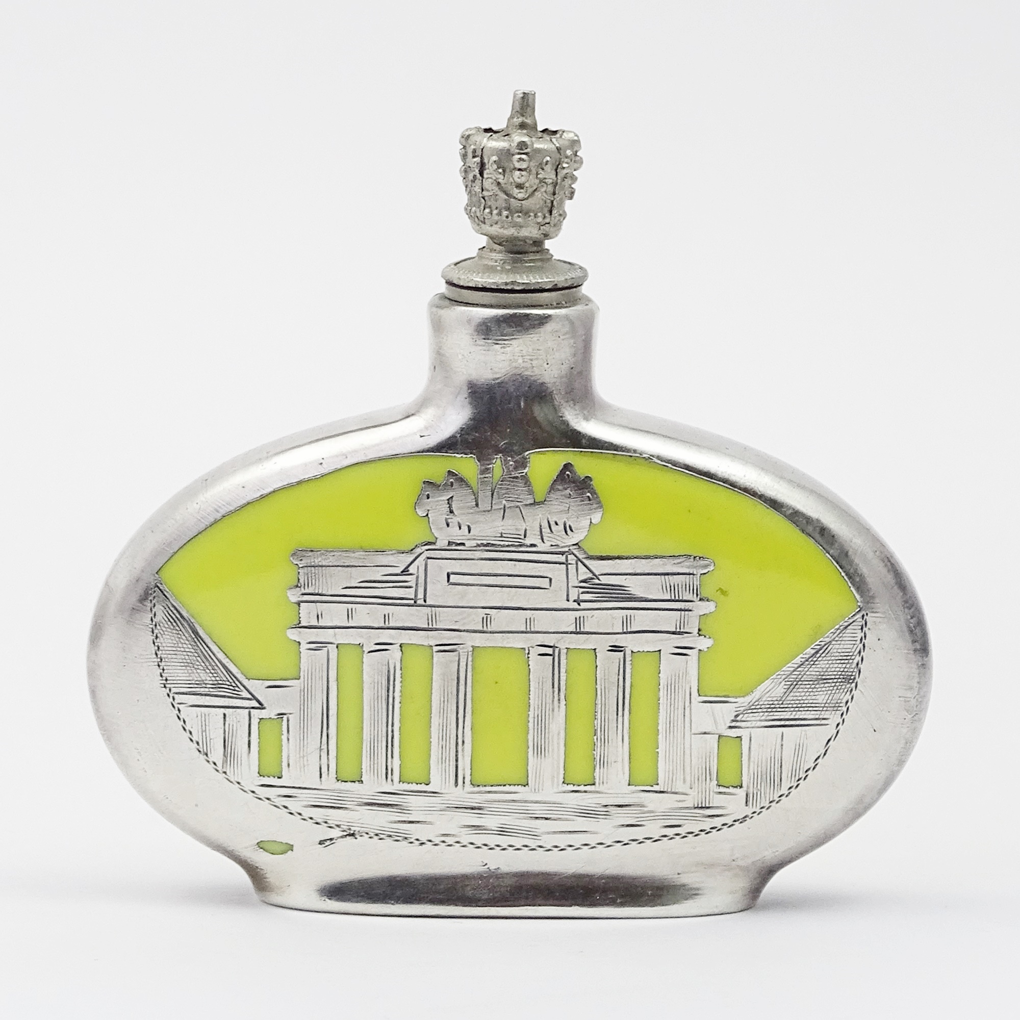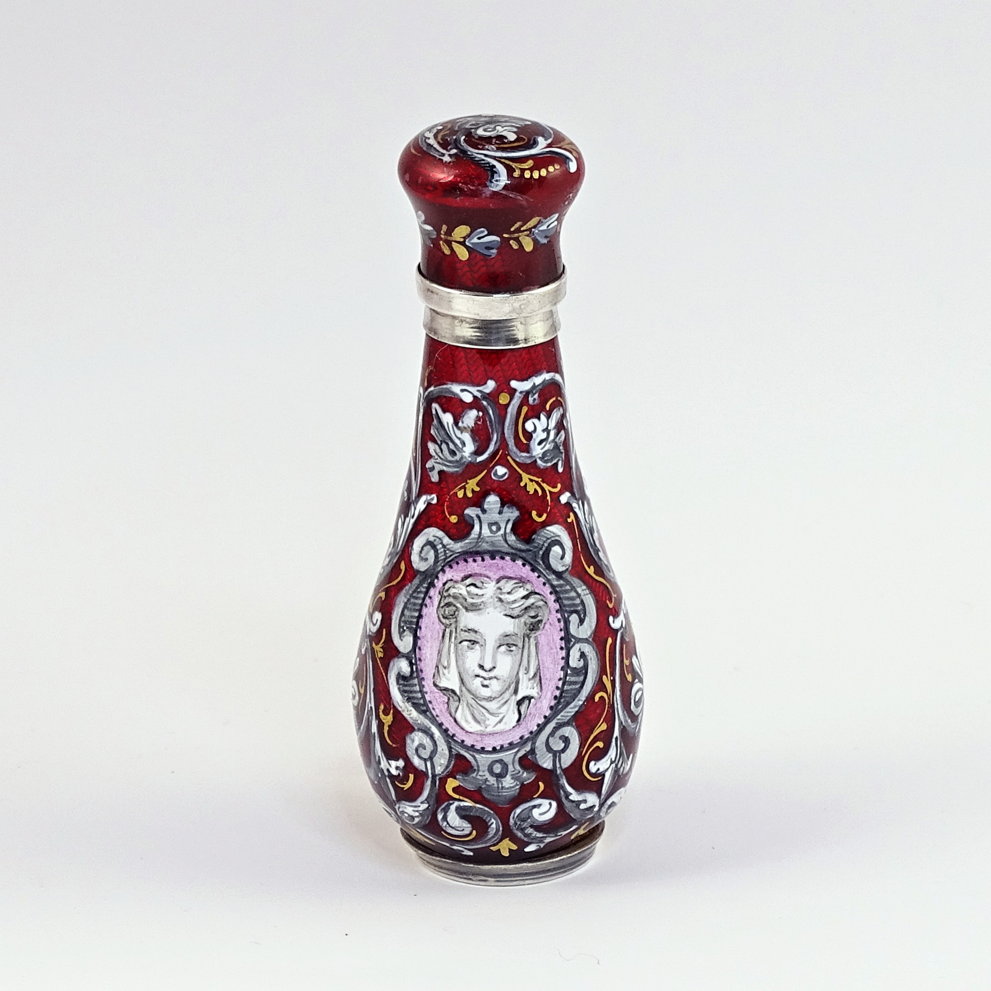 Red enamelled metal scent bottle with rich decor and a round medallion showing the portrait of a woman Discover more