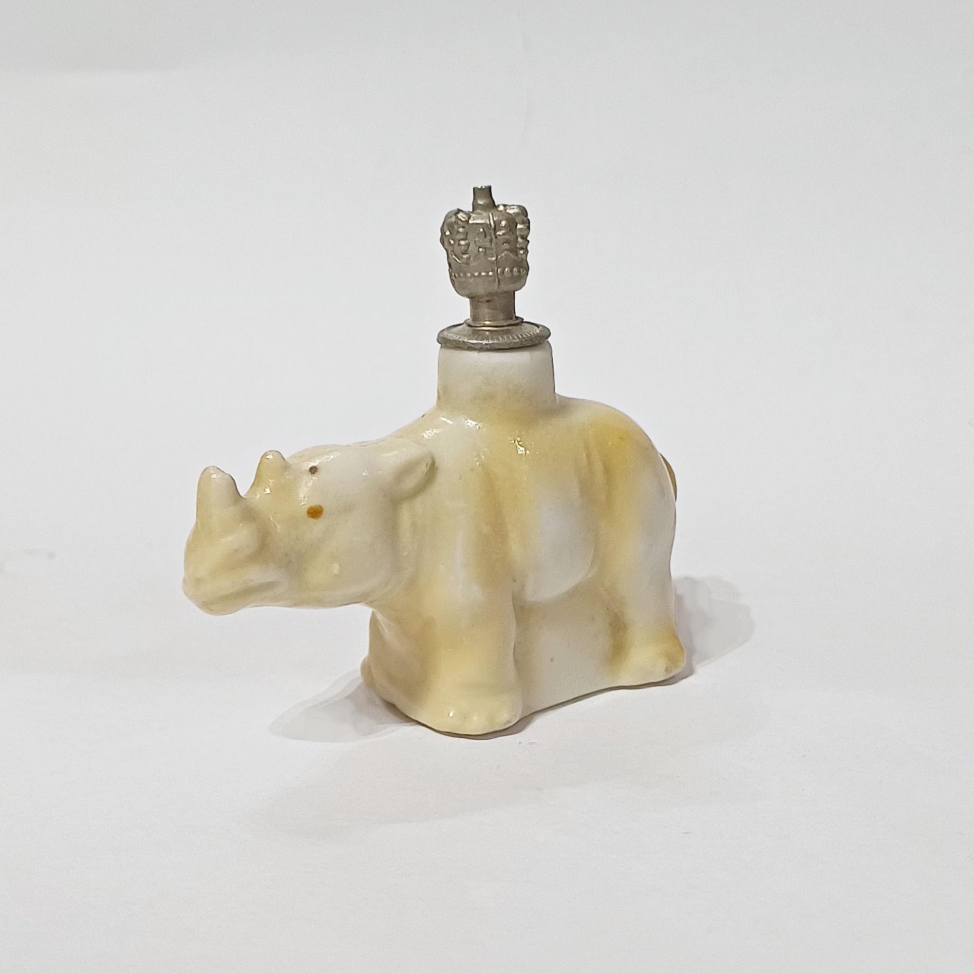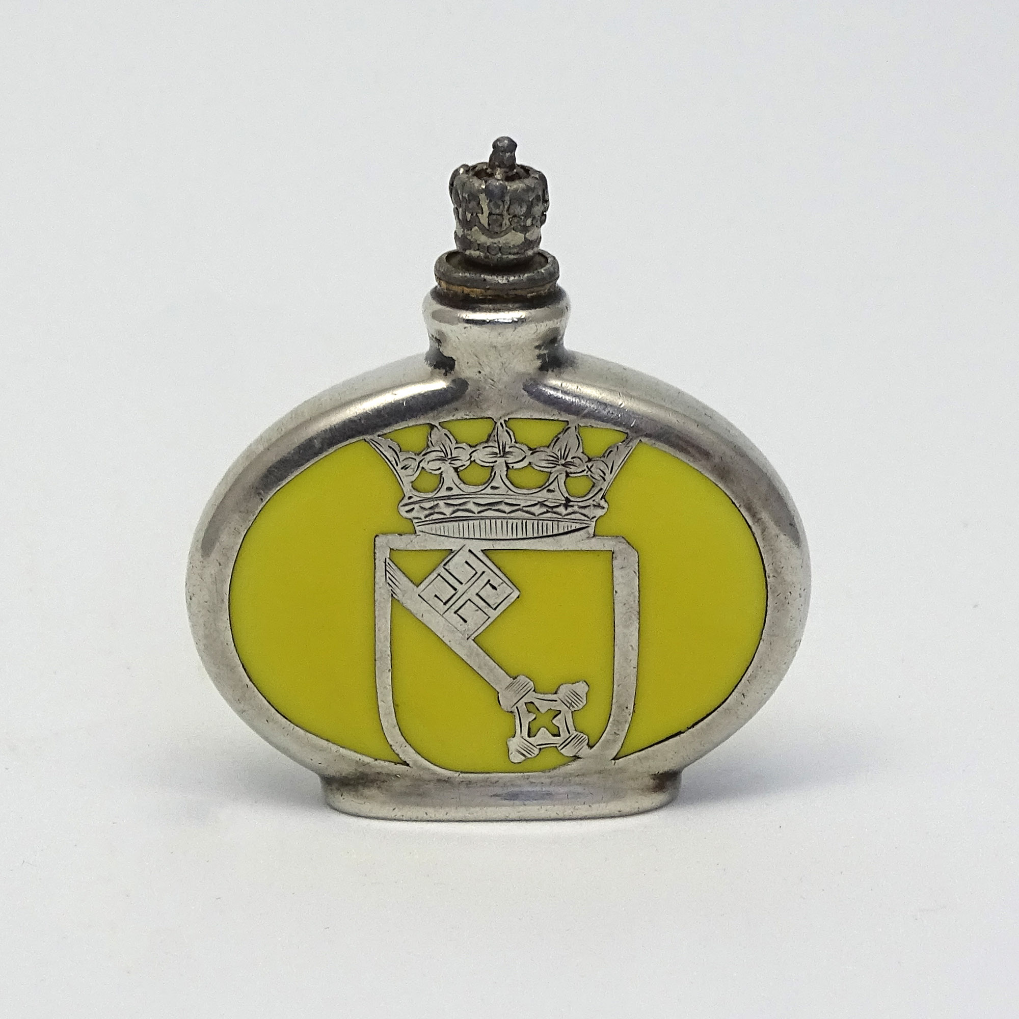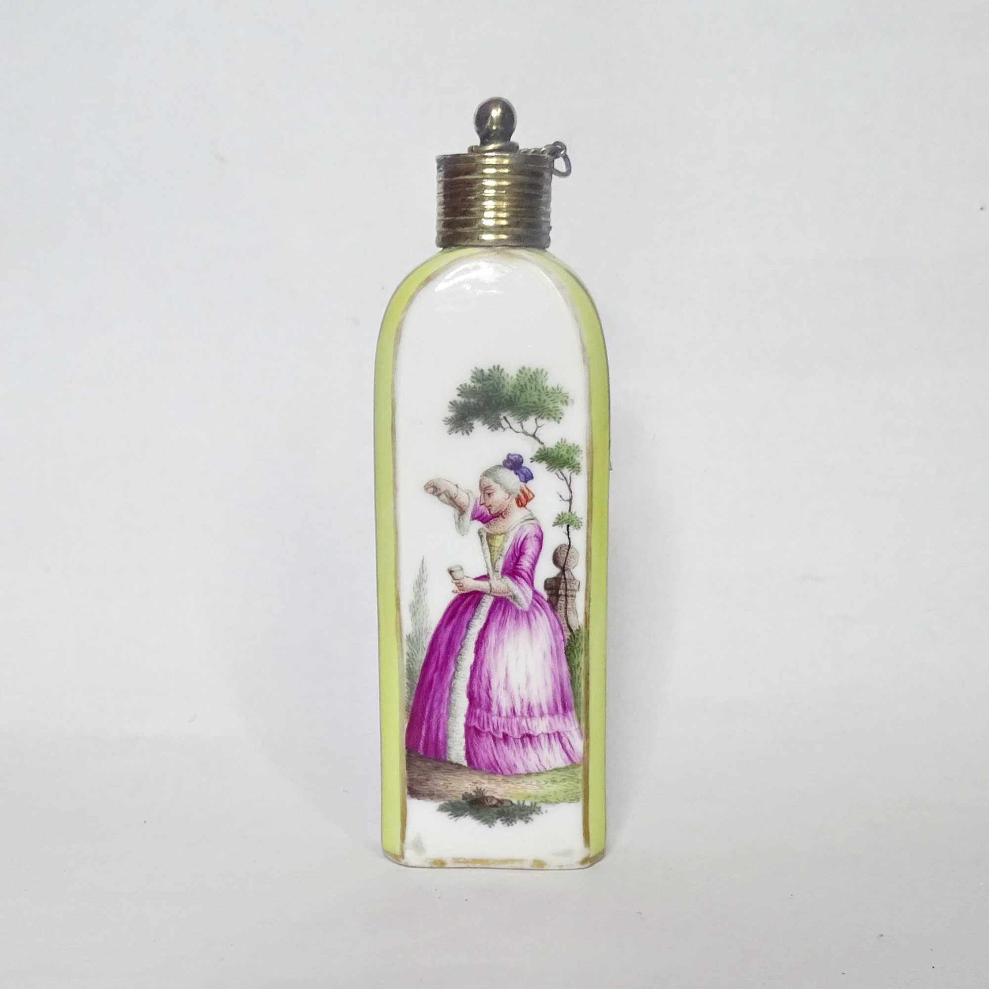 Ribbed scent bottle in polished malachite glass with a porcelain medallion painted with a costume serenade Discover more