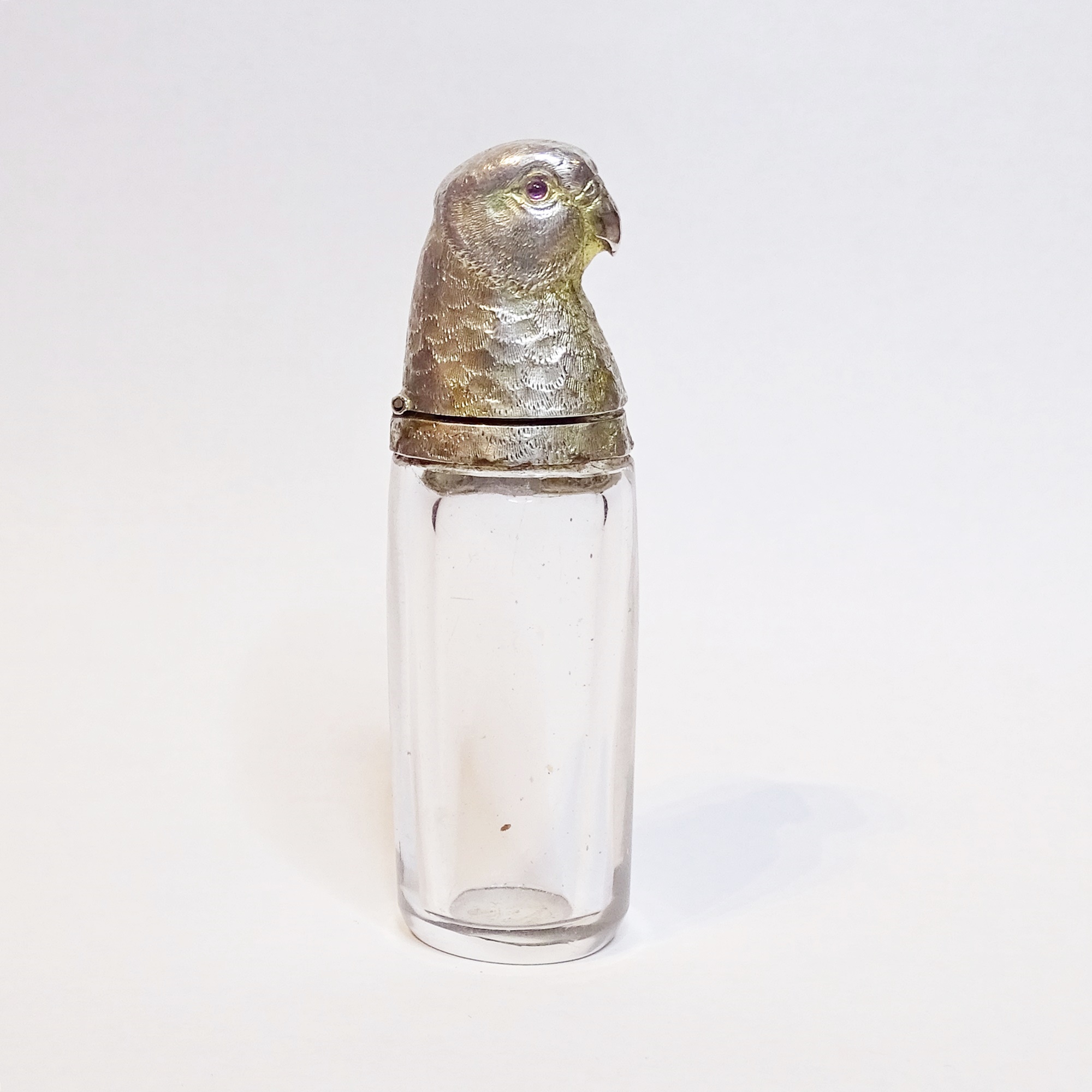 Turquoise Bilston enamel case, hand-painted with four panels of flowers and glass scent bottle Discover more