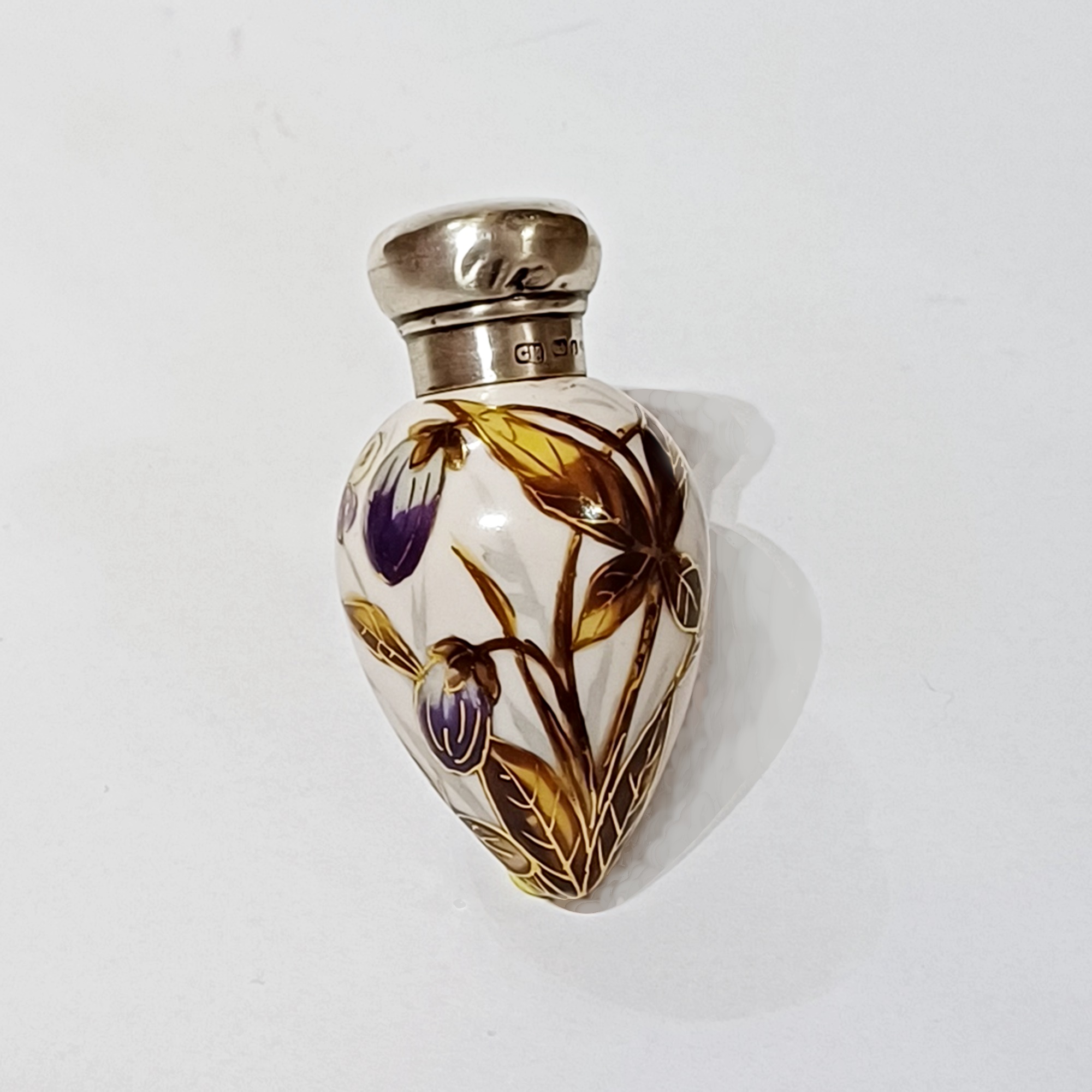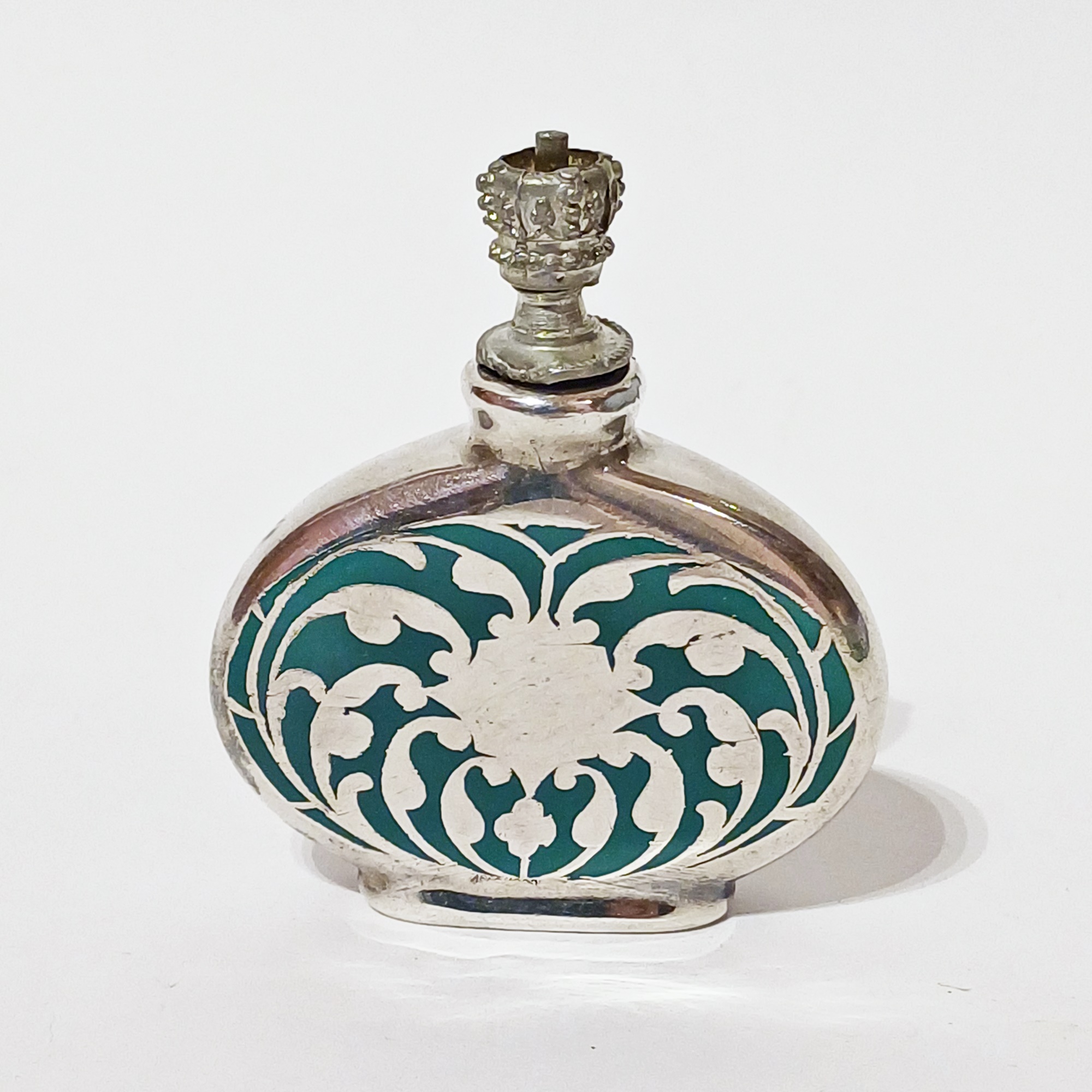 Silver overlay dark green porcelain scent bottle with a formal decor resembling a firework Discover more