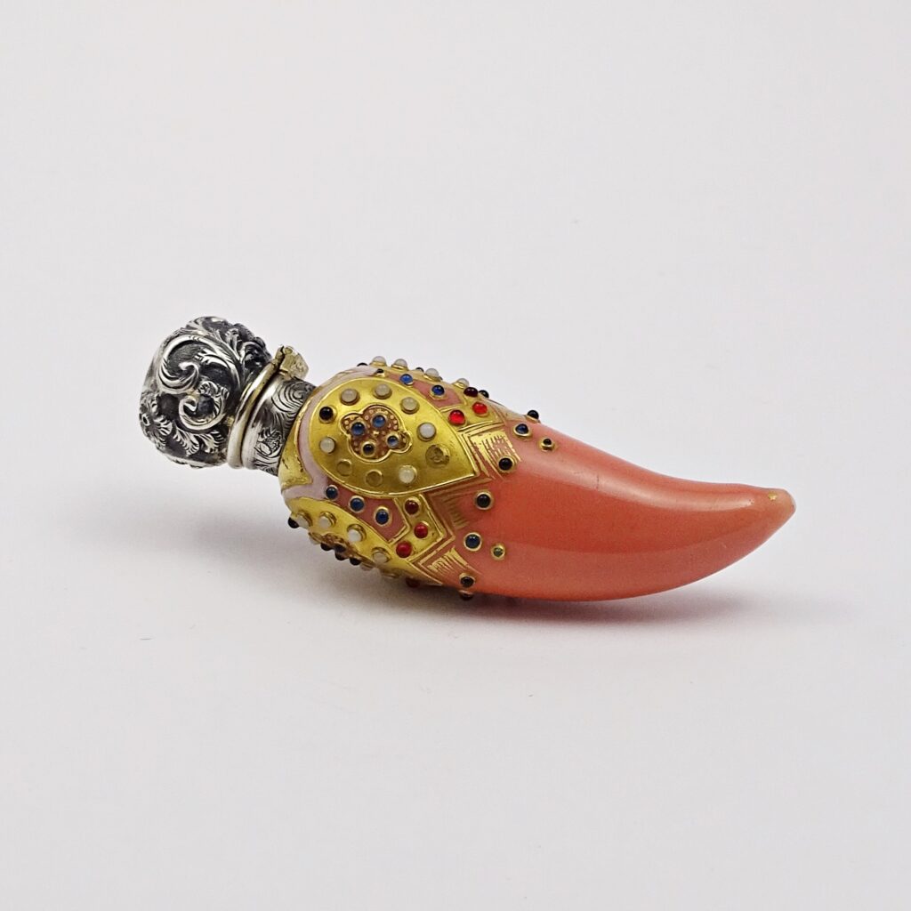 Rare opaline “gorge de pigeon scent bottle in form of a horn; the elaborate Arabesque/Persian design is the work of Oscar Pierre Erard created with gold paste and enamel with applied cabochon glass stones of turquoise, moonstone, sapphire and coral.